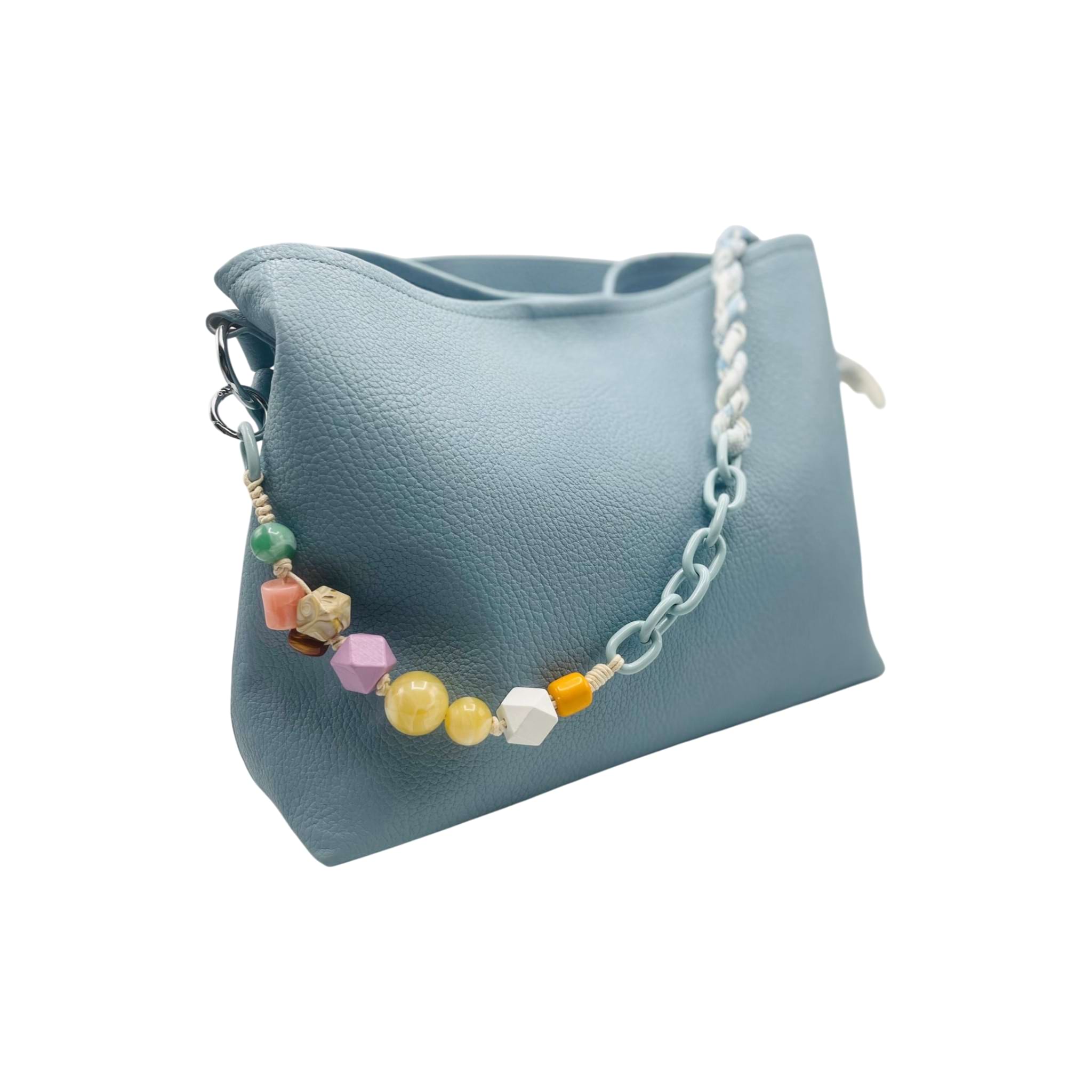 Das sanfte Blau wirkt ruhig, klar und stilvoll. Es lässt dich frisch aussehen, ohne dich zu überladen. Der besondere Hingucker? Die verspielte Ketten- und Perlen-Details, die deinem Look Persönlichkeit verleihen. Nicht laut. Aber unübersehbar.
