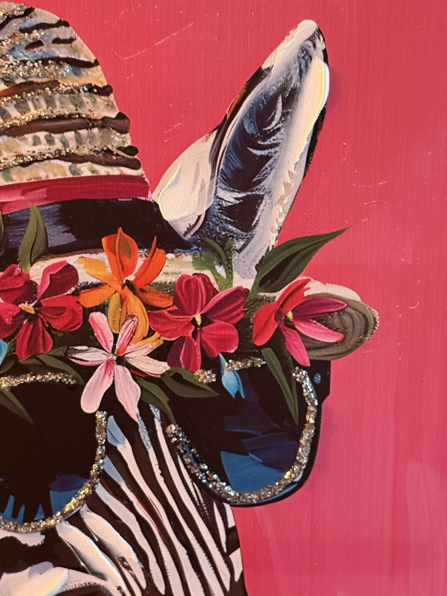 Statement-Piece fürs Zuhause: Zebra mit Sonnenbrille, Blumenkranz und knalligem Pink. Macht jede Wand sofort frecher und ist genau dieser „wow“-Moment im Raum.